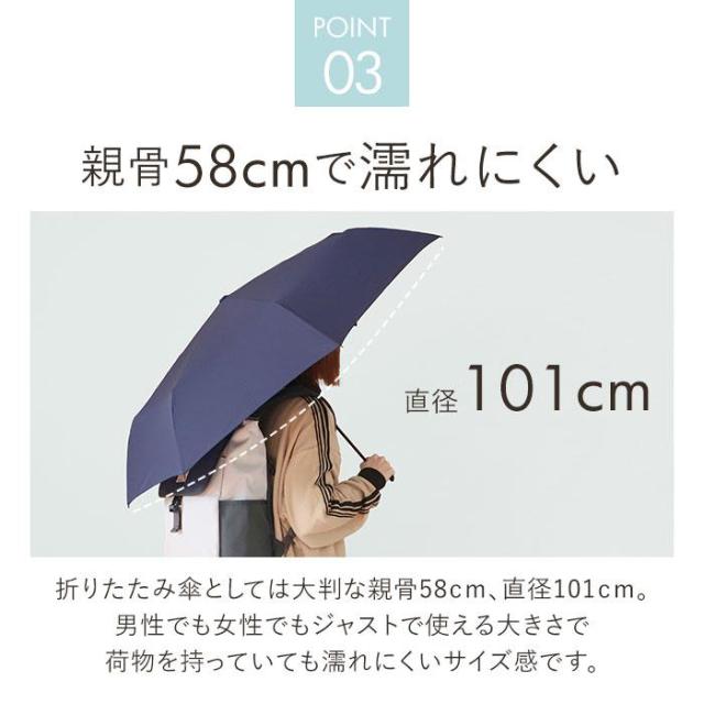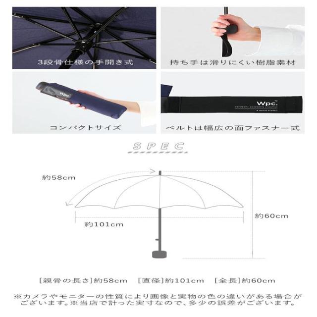 「Wpc.」から、持つ人を選ばないベーシックな折りたたみ傘「Basic Folding Umbrella」が登場。(親骨58cmタイプ)3段骨仕様の手開き式で、傘骨をポキポキ折らずカンタンに開閉できる!爪や指を挟むのを防止する安全ろくろ付き。男性でも女性でもジャストサイズで使える、親骨58cmサイズ。滑りにくい樹脂素材の持ち手は太めに設計されており、男性でも女性でも持ちやすい。一般の傘と比べて長期的に継続する撥水加工済み!さらに紫外線防止効果もあり、雨の日だけでなく日差しの強い日も使える晴雨兼用傘。(※紫外線遮蔽率…淡色:約80%、濃色:約90%。色の濃淡により異なります。)傘生地をまとめるバンドは、サッと留められて便利な幅広の面ファスナー式。付属の収納袋はサイドファスナーで大きく開くから、傘の出し入れがラクラク。ユニセックスで使えるデザインをラインナップ。プレゼントにもおすすめ。