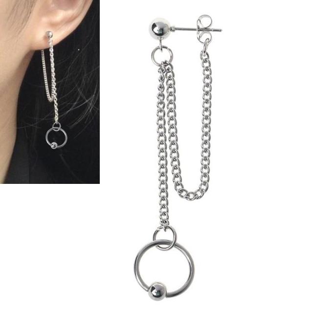 シンプルな5mmのボールピアスとキャッチをチェーンでつなげ、ボディピアスのリング型キャプティブリング(CBR)のパーツを鎖の先端につなげたロングチャームのステンレスピアス。メンズでもレディースでもジェンダーレスでも使えるおしゃれなステンピアスはペアルックやプレゼントにも。素材も安心のステンレスなのでどんな場面でも使えます。耳たぶだけでなく軟骨ピアスにも使えるチェーンピアス。存在感のあるステンレスピアスはスーツなどのフォーマルなスタイルにも似合う。