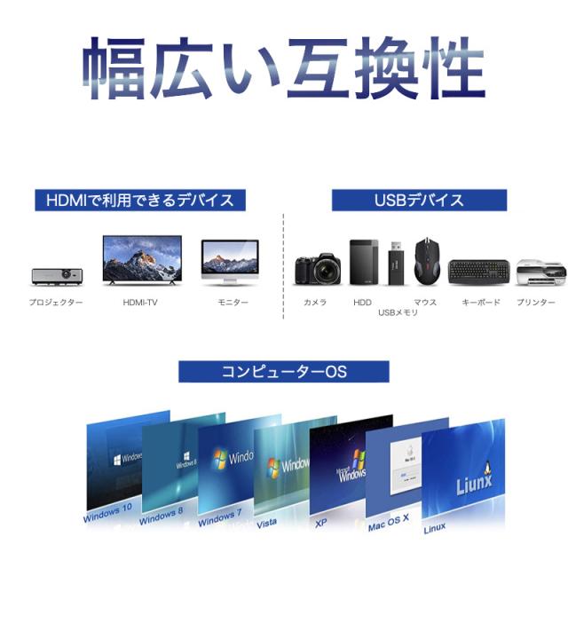 | サポート対応OS | Google Chrome OS; MAC OS; Windows7/8/10/11; Huawei Matebook; Xiaomi Book and other mainstream operating systems ・USB-A 3.0ポート搭載機種 MAC OSは次のOSのみに対応しております。 ・Big Sur (11) ・Mojave, Catalina (10.14.2-10.15) ・High Sierra (10.13.4-10.14.1) クローンモードの未対応 ・High Sierra (10.13-10.13.3) ・Sierra (10.12) ・El Capitan (10.11) ミラーモード非対応 |