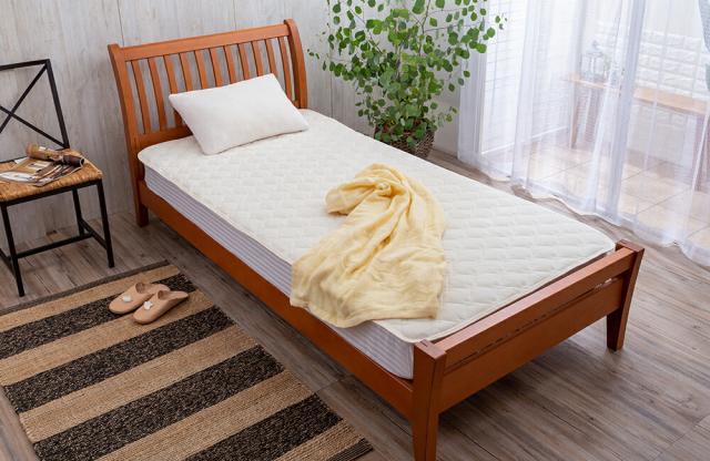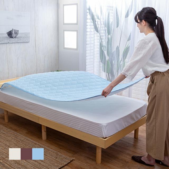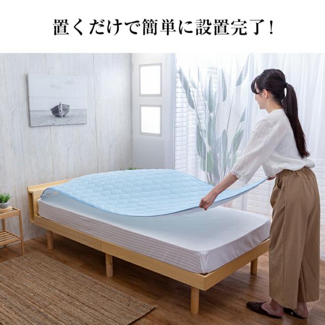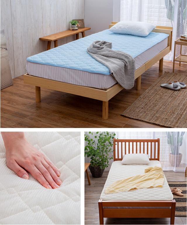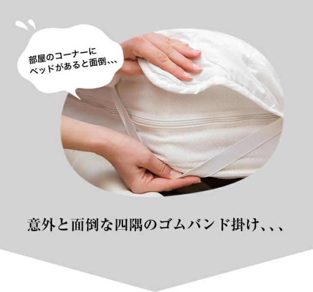 四隅ゴムバンド不要の置くだけ簡単敷きパッド。一般的な敷パッドはゴムバンドでの取り付けが面倒でしたが、この敷きパッドは裏面にすべり止め加工を施しているのでマットレスや敷布団上に敷くだけ!やわらかくふんわりとした肌触りの良い洗えるパイルニット地を使用。