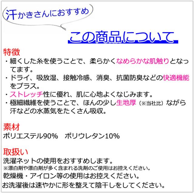 ・極細繊維を使うことで、ほんの少し生地厚(※当社比)ながら汗などの水蒸気をたくさん吸収します。汗かきさん”におすすめのアイテムとなってます。 ・ドライ、吸放湿、消臭、抗菌防臭などの快適機能をプラス。 ・ストレッチ性に優れ、肌に心地よくなじみます。 ・通常より細い繊維を使うことで、なめらかな肌触りとなっております。 素材 ポリエステル90%・ポリウレタン10% 取扱い 洗濯機・ネット使用 |
