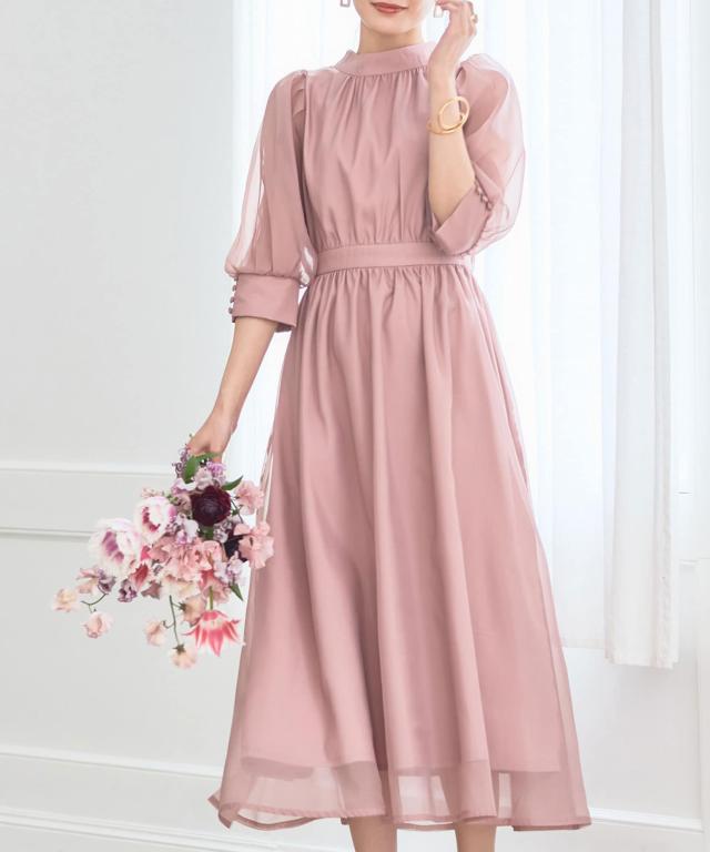 ふんわりとした七分丈のパフスリーブ、スタンドカラー+バックリボンの王道フェミニンワンピ。