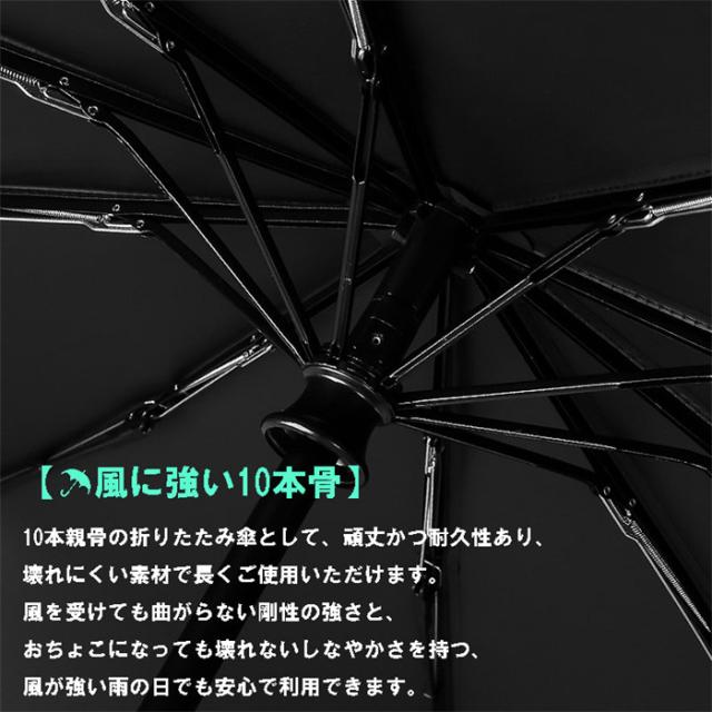 | 商品特徴 | 1、優れた耐風性:丈夫で壊れにくい10本骨!しっかりとした作りで風雨から守ってくれます。アルミニウム合金製中棒とガラス繊維&スチール製の傘骨を採用するので、錆びなくて、普通の傘より風に強い設計で、鉄製の傘より結構軽くて、豪雨、強風にも安心できます。 2、超撥水性:高密度のNC布と撥水加工なので、普通の折り畳み傘より撥水性があり、豪雨の中でも、体が濡れることはありません。折りたたみ傘に超撥水のテフロン加工を施すので傘を閉じた後、軽く振るだけで、水滴が簡単に振り払えます。 3、収納ポーチ付き:濡れた折り畳み傘の収納ポーチ付きます。訪問先や電車バスに乗る際のわずらわしさが解消されます。 4、持ち運びやすい:ワンタッチボタンで一秒で開閉できるので便利で安全です。ガラス繊維&スチール製により軽くて持ちやすく、一般的な傘と同じ八本骨で耐久性も十分です。 5、全自動開閉折りたたみ傘。耐久性のある高密度で防水性の高い布地を利用しているため、撥水性に非常に優れております。 |