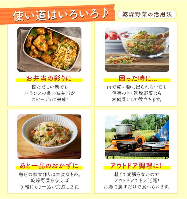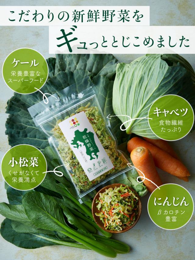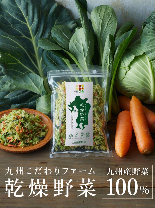 九州の恵!キャベツ・にんじん・こまつな・ケール、全てが「九産野菜100%」のこだわり乾燥野菜です。インスタント食品に加えるだけで野菜不足解消に!乾燥しているので保存に便利。