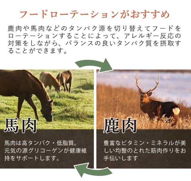 ベニソンレシピと馬肉レシピのお得なローテーションセット。タンパク源を切り替えてフードをローテーションすることによって、バランスの良いタンパク質を摂取することができます。