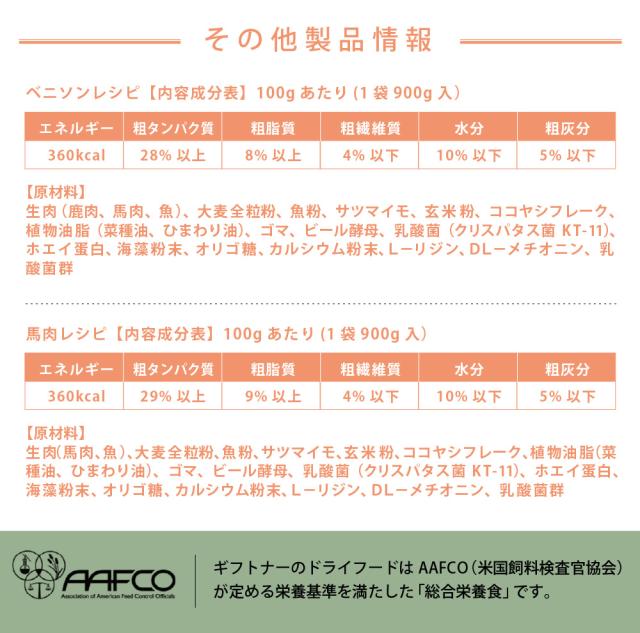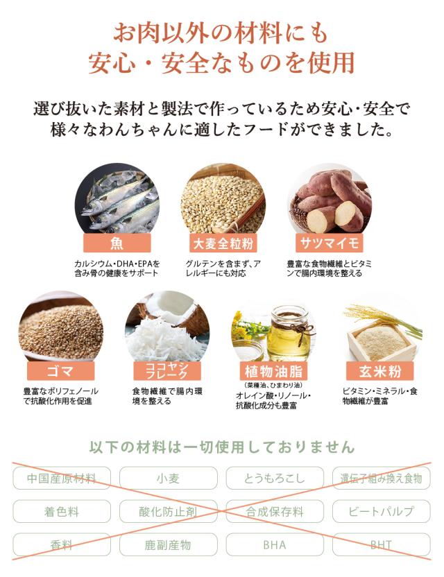 【原材料】:生肉(鹿肉、馬肉、魚)、大麦全粒粉、魚粉、サツマイモ、玄米粉、ココヤシフレーク、植物油脂(菜種油、ひまわり油)、ゴマ、ビール酵母、乳酸菌(クリスパタス菌KT-11)、ホエイ蛋白、海藻粉末、オリゴ糖、カルシウム粉末、L-リジン、DL-メチオニン、乳酸菌群