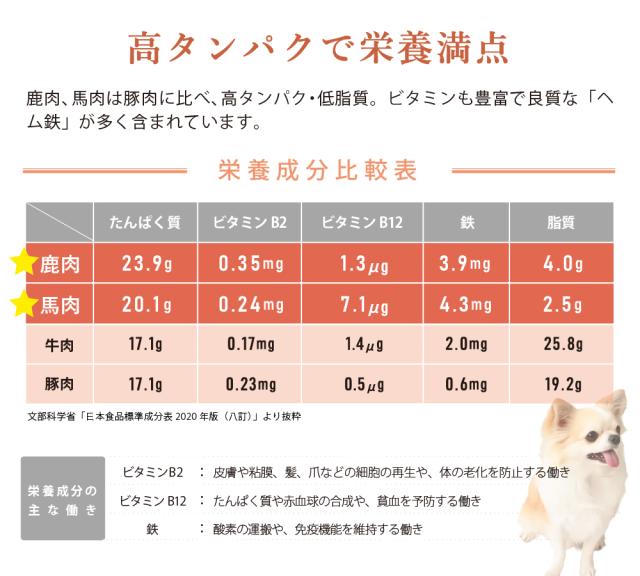 鹿肉・馬肉はビタミンや鉄分を多く含み、高たんぱく・低脂肪です。