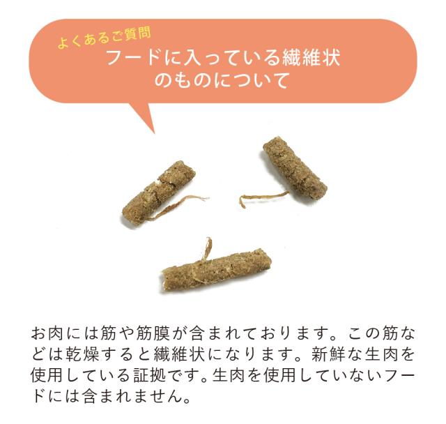 【原材料】:生肉(鹿肉、馬肉、魚)、大麦全粒粉、魚粉、サツマイモ、玄米粉、ココヤシフレーク、植物油脂(菜種油、ひまわり油)、ゴマ、ビール酵母、乳酸菌(クリスパタス菌KT-11)、ホエイ蛋白、海藻粉末、オリゴ糖、カルシウム粉末、L-リジン、DL-メチオニン、乳酸菌群