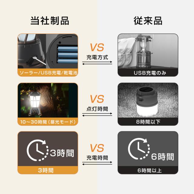 【USB充電式&乾電池給電&ソーラーランタン】USB充電式と乾電池給電とソーラー充電の3種類給電方式があります。LEDランタン本体にはUSB充電口を設けるので、パソコン、モバイルバッテリーから約3.5H充電完了です。また、ソーラーパネルを搭載し、日当たりに置いて自動充電できます。ソーラーランタンなら、外出先でも太陽の光さえあればどこでもいつでも充電可能です。いざという時にも安心です。それに充電ができない場合でも乾電池を使用して、すぐ使えます。超便利です。