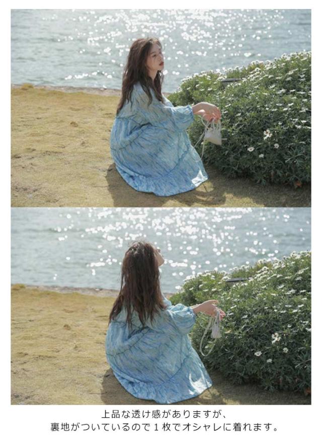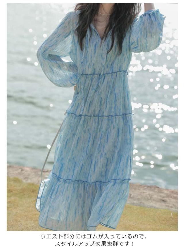 送料無料 ワンピース ワンピ シフォンワンピース ロングワンピース 長袖 きれいめ 体型カバー ブルー 花柄 春 夏 ミディアム丈 ロングワンピ レディース ロング シフォン 大きいサイズ 小花柄 マタ二ティ マタニティワンピース Aライン 夏 海