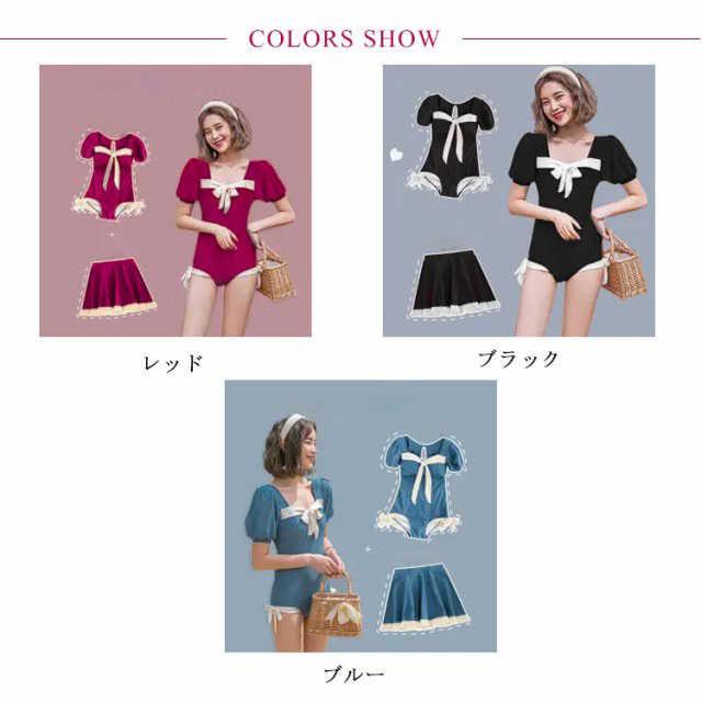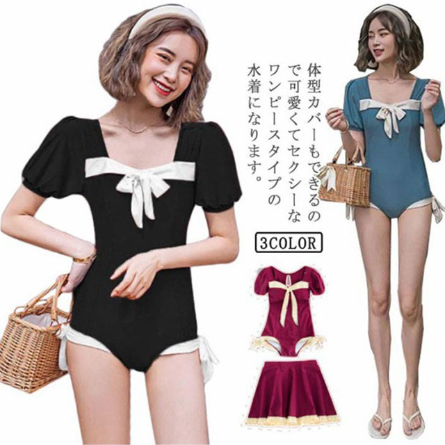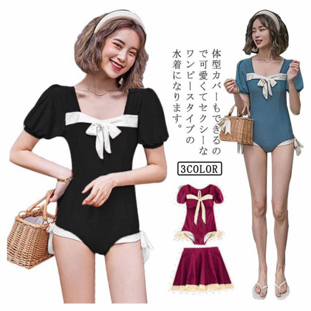 水着 レディース 2点セット オールインワン スカート 体型カバー 夏 水陸両用 フリル フレアスカート 温泉 海水浴 水泳 プール ビーチ 海 リゾート ガーリー 少女 リボン セクシー かわいい