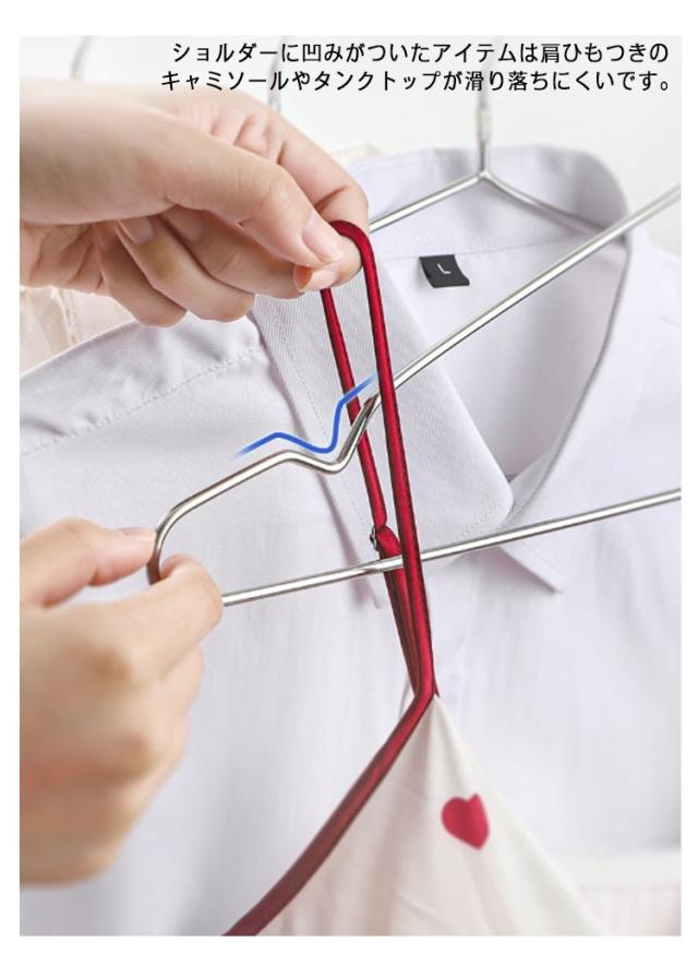 | 耐久性や防サビ性に優れているステンレスハンガー。 ショルダーに凹みがついたアイテムは肩ひもつきのキャミソールやタンクトップが滑り落ちにくいです。 先端が丸みを帯びた独特の形状となっています。 細いラインで華奢に見えますが、オールステンレスで曲がりにくく耐久性が高いのもうれしいです。 | |