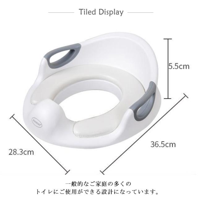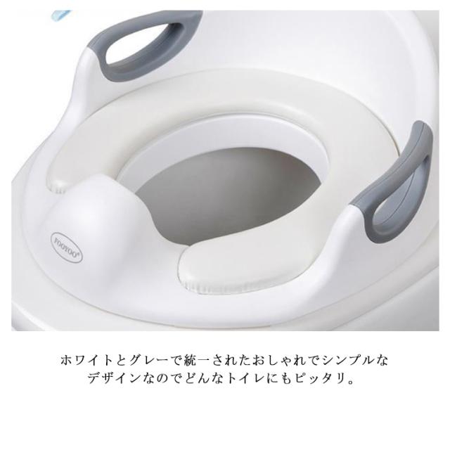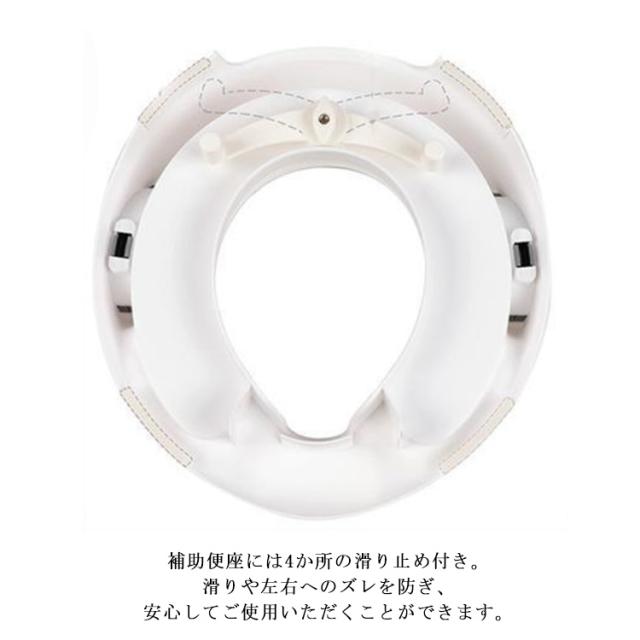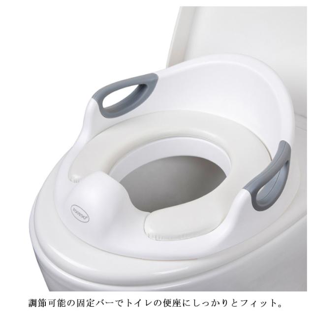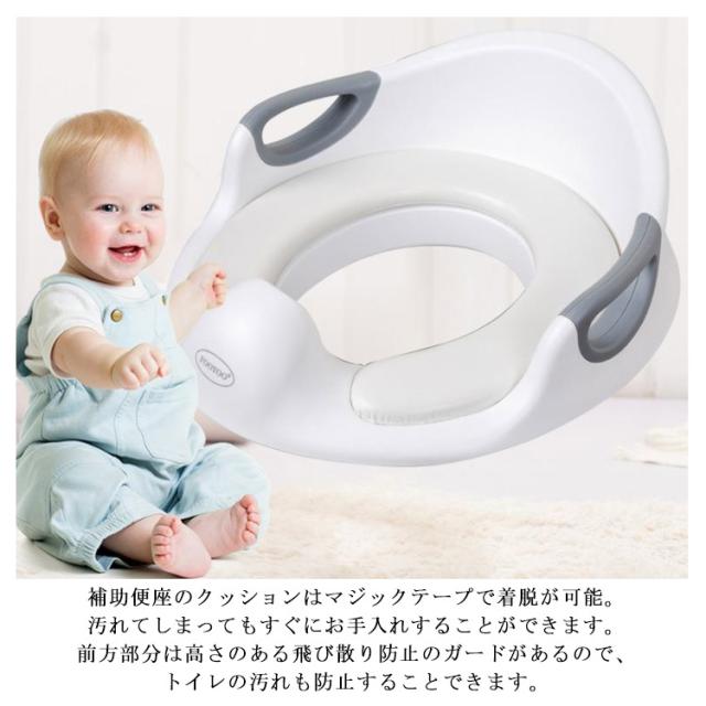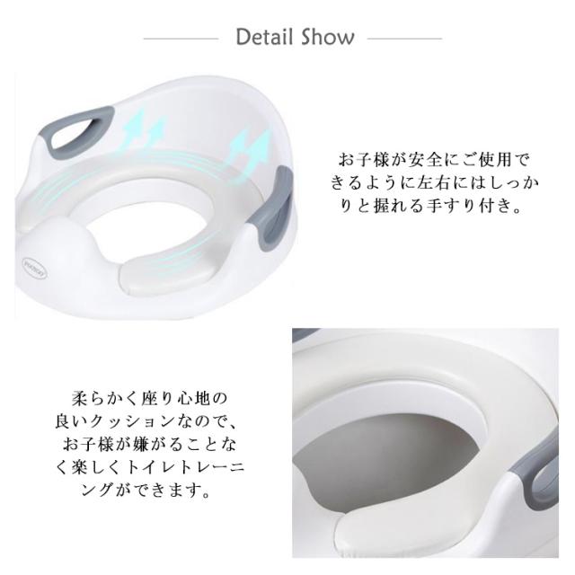 | 【様々なタイプのトイレに対応・簡単設置の子ども用補助便座】 ・一般的なご家庭の多くのトイレにご使用ができる設計になっています。 ・補助便座には4か所の滑り止め付き。 ・調節可能の固定バーでトイレの便座にしっかりとフィット。 滑りや左右へのズレを防ぎ、安心してご使用いただくことができます。 ※スマートトイレ、四角型のトイレにはご使用できません。 【お子様のトイレ補助、練習に】 ・お子様が安全にご使用できるように左右にはしっかりと握れる手すり付き。 ・柔らかく座り心地の良いクッションなので、お子様が嫌がることなく楽しくトイレトレーニングができます。 【衛生的でいつでも安心】 ・補助便座のクッションはマジックテープで着脱が可能。汚れてしまってもすぐにお手入れすることができます。 ・前方部分は高さのある飛び散り防止のガードがあるので、トイレの汚れも防止することできます。 【シンプルで馴染みの良いデザイン】 ・ホワイトとグレーで統一されたおしゃれでシンプルなデザインなのでどんなトイレにもピッタリ。 ・使用しないときは付属のフックに引っ掛けておけるので収納場所にも困りません。 | |