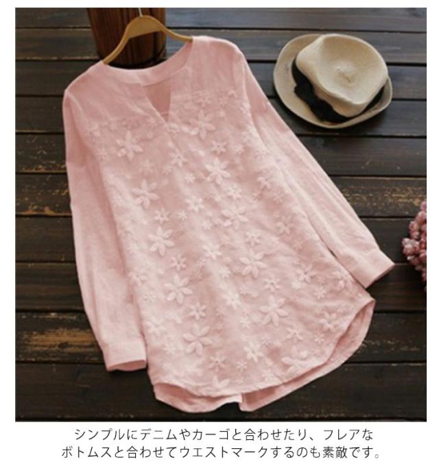 刺繍ブラウス トップス レディース レース ブラウス Vネック キーネック プルオーバー 長袖 花柄 大きいサイズ 切り替え シャツ カジュアル チュニック 送料無料 春 夏 秋 コットン