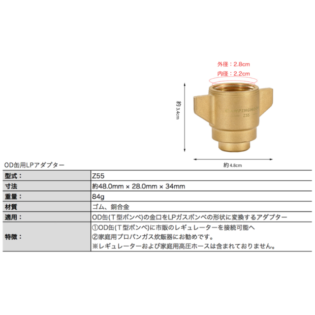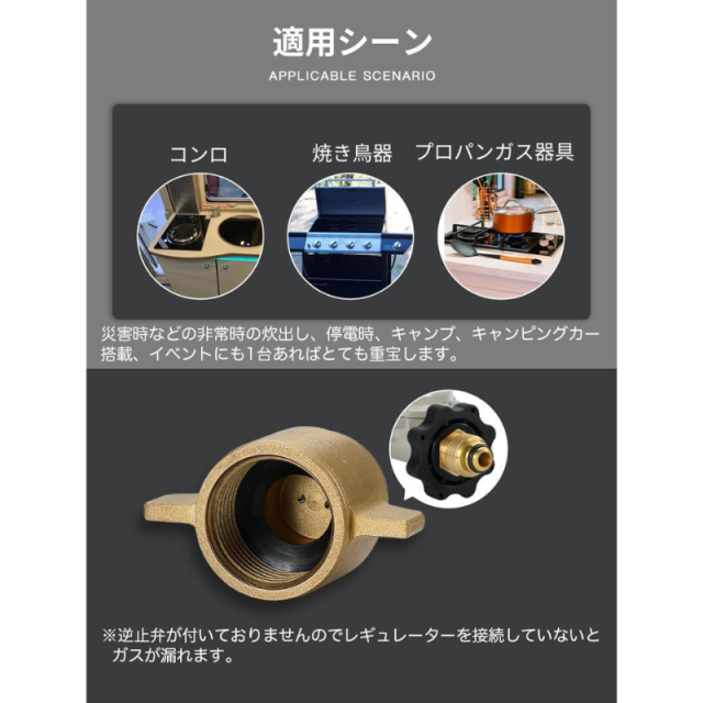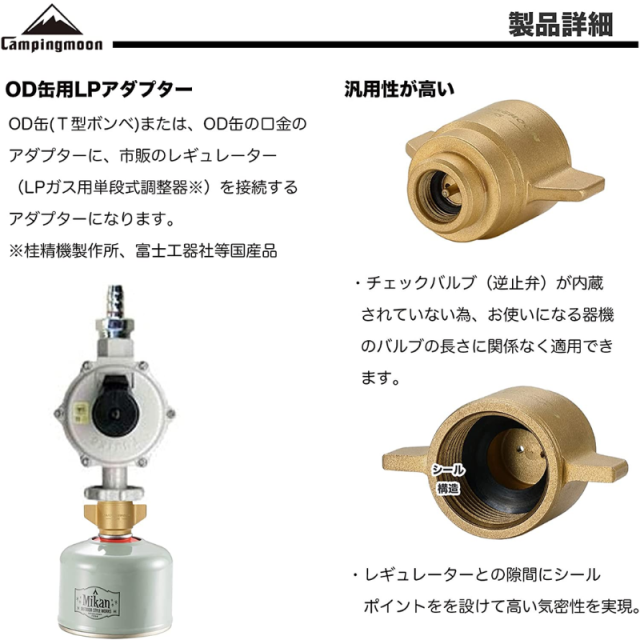 ■製品特徴:アウトドア缶(OD)に取り付け、LPガスレギュレーターに接続することができます。
