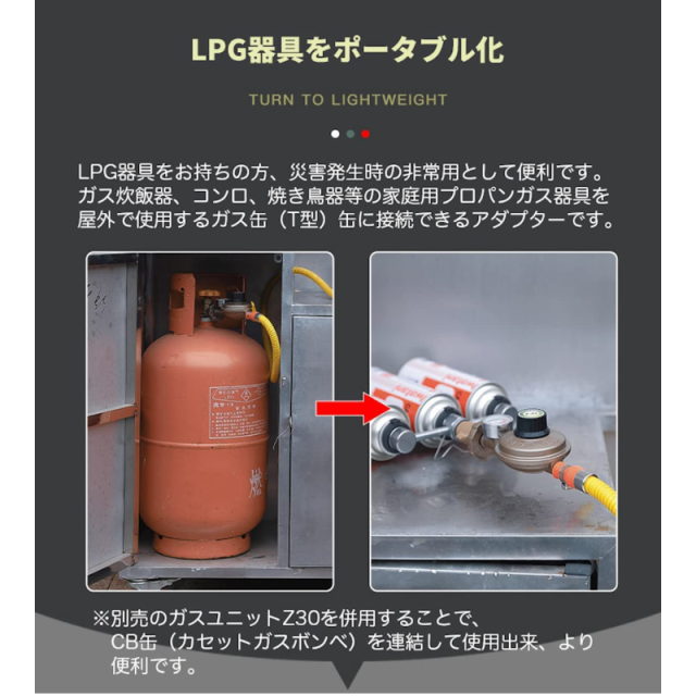 ※別売のガスユニットZ30を併用することで、CB缶(カセットガスボンベ)を連結して使用出来、より便利です。