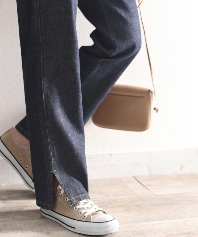 冬新作 クラシカルエルフ レディース 体型カバー ウエストゴム UV《ms+ ideal》ボトムス 大きいサイズ デニムパンツ チノ サイドスリット ハイウエスト 綿100% ce0900006