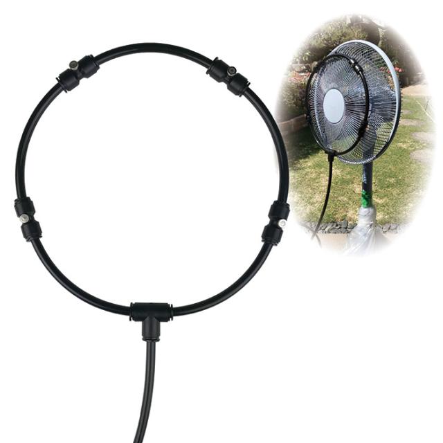 真夏の体感温度を下げることで大人気になったミストを、扇風機に取り付けることで、さらに涼しさを増してくれる扇風機用のキットです。ミストによる気化熱効果に風が加わることで、体感温度は爽快そのもの。本製品は、ミストシャワーをご家庭でも簡単なDIY作業で、お手持ちの扇風機に合わせてセットができるキットセットです。キットを扇風機に取り付けたら、水道栓に付属のアタッチメントで水を引き込みます(本品は上水道専用です)使用の際は、必ず扇風機を作動させてから通水してください。放出されるミストの粒子は、5μmという細かな仕様にしているので、水道代金も1時間あたり約1.2円程度と節水も実現。お庭での使用はもちろん、学校や幼稚園、店舗などの入り口付近などでのご使用もオススメです。
