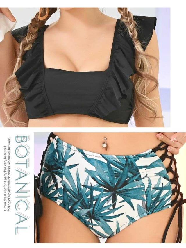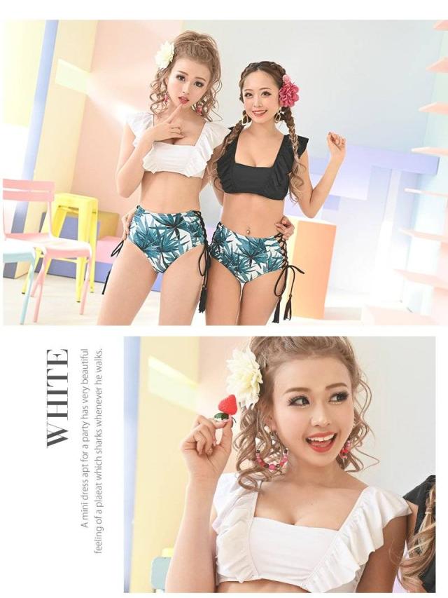 ☆リゾート感たっぷりのボタニカル柄にサイドの編み上げタッセルから除く素肌がセクシーなハイウエストビキニショーツがセクシーな韓国風ビキニ♪