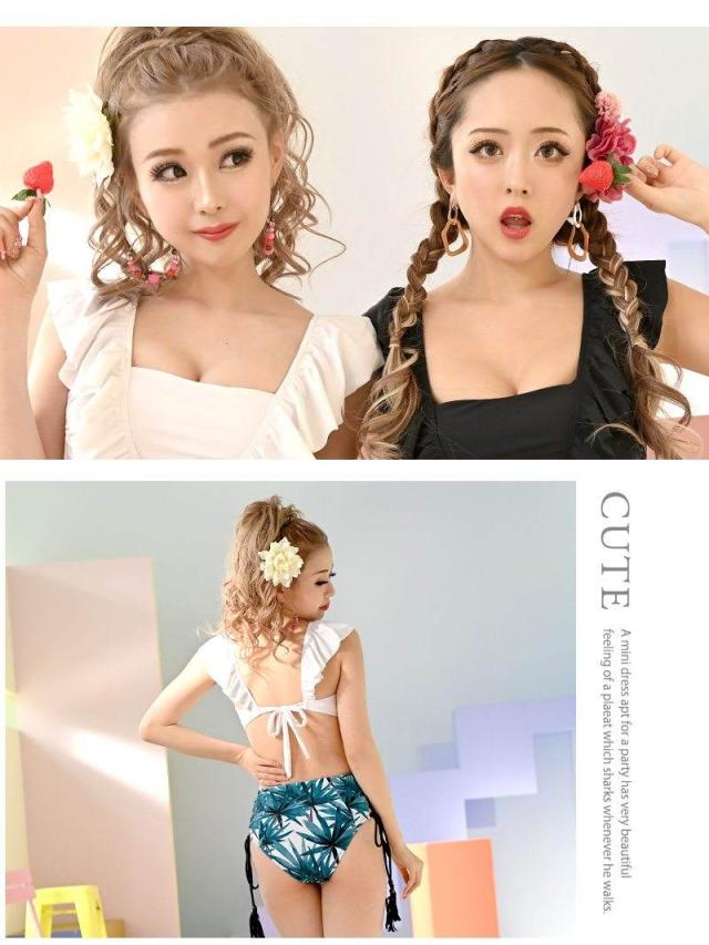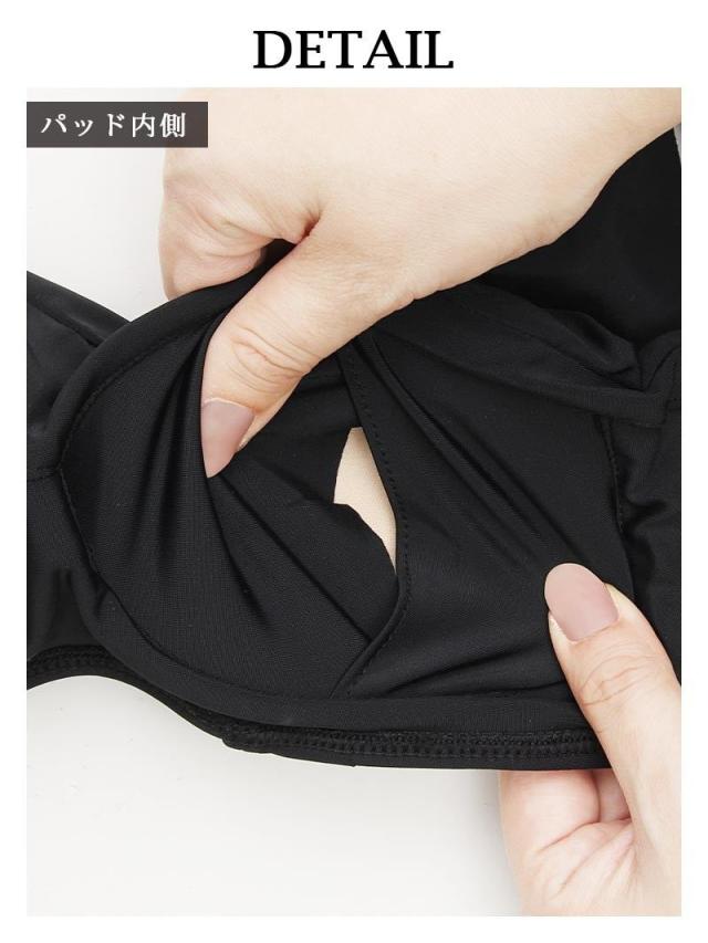 ☆ビスチェ風ビキニブラの袖はフェミニンなフリルデザインになっており肩周りをさり気なく隠してくれるので二の腕カバー効果も期待できるビキニセットです♪