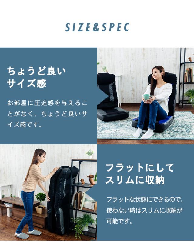 - 立てて収納出来るとの事で購入したけれど、フラットにならないので、立てて収納は出来ません。 「く」の形にはなるので、その状態にして壁に無理やり立てかける事は可能です(邪魔だけど) ただ、座り心地が良いので、フラットにならないのも帳消し。座布団に座っていると腰が痛くなってしまって辛かったのですが、この座椅子を購入してから腰が痛くなくなりました!