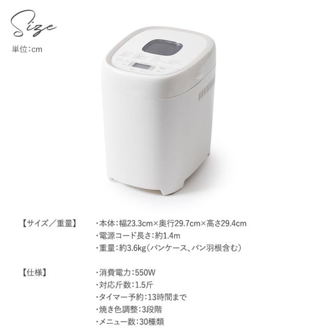 ・付属品:計量カップ、計量スプーン、パンケース、パン羽根、羽根取り棒、ヨーグルト専用容器、オリジナルレシピブック、取扱説明書(保証書)