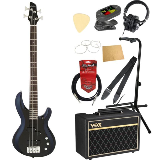 エレキベースにVOXアンプ「VOX Pathfinder Bass 10」、ケーブル、チューナー、ストラップ、換え弦、スタンド、ピック、クロス、ヘッドホンをお付けした10点セットです。