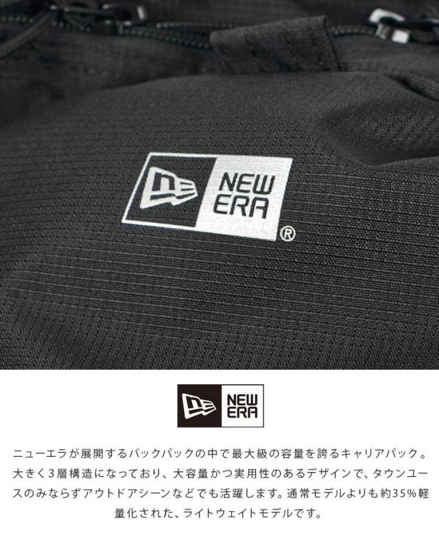 ニューエラが展開するバックパックの中で最大級も容量を誇るキャリアパック。 大きく3層構造になっており、大容量かつ実用的のあるデザインで、タウンユースのみならず アウトドアシーンなどでも活躍します。通常モデルよりも約35%軽量化された、ライトウェイトモデルです。