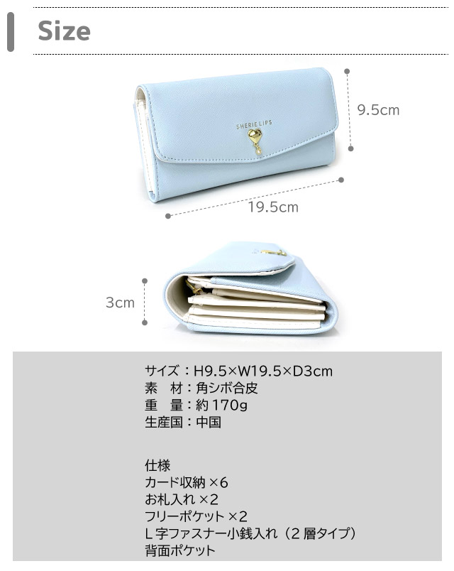 ![]() ![]() ![]() ![]() ![]() ![]() ・Sherie Lips シェリーリップス ハート&パール きれいめ大人っぽかぶせ長財布。 シンプルデザイン&高級感のある合皮で大人可愛いデザイン。 フロントのハート&パールがポイント 大きく開くから中身が見やすく、カードもたくさん収納できます。小銭入れはファスナー開閉です。 小学生・中学生・高校生の女の子に人気で、お誕生日やクリスマス等のプレゼントにもおすすめです。