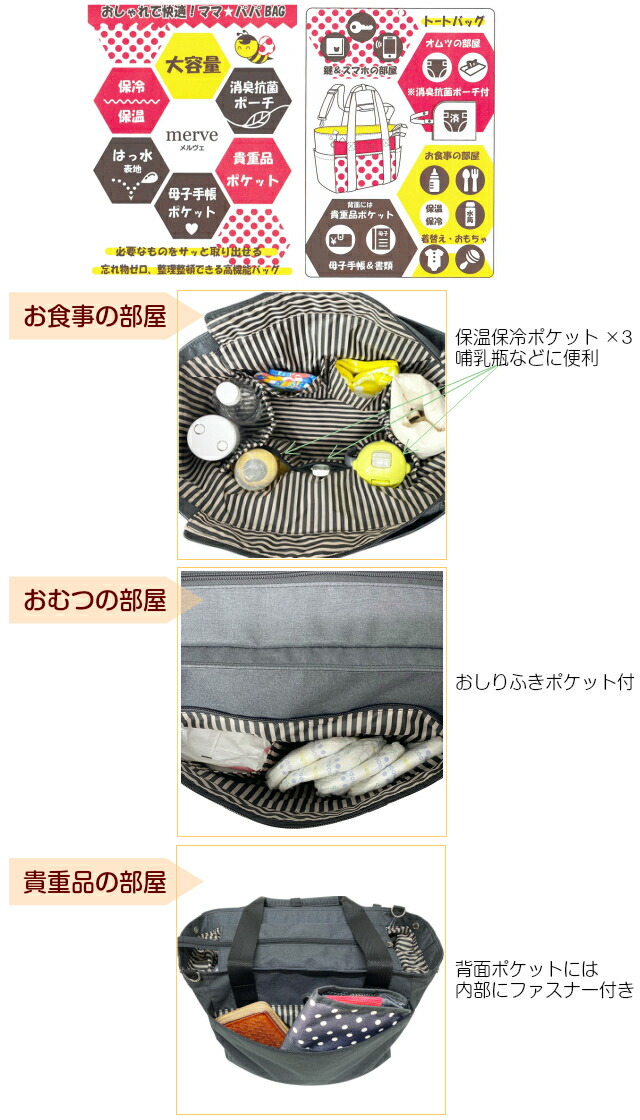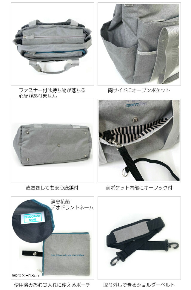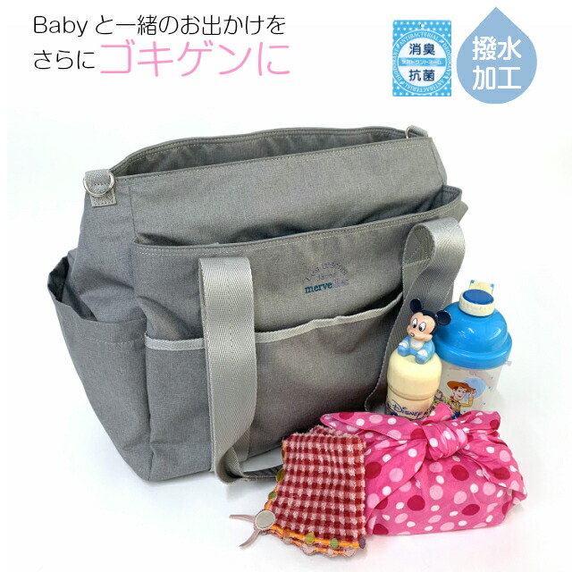 ![]() ![]() ![]() ![]() ![]() ![]() ・merve メルヴェ たくさんのママ・パパの声を集めて作られた、 ママ・パパのための多機能マザーズバッグ。 2way仕様でトートバッグ・ショルダーバッグとしてお使いいただけます。 はっ水加工済みで多少の雨にも対応 保冷・保温ポケットは哺乳瓶やマグを入れるのにぴったり 使用済みオムツをすぐに処分できないときに役立つ消臭ポーチ付き パパもママも持てる男女兼用デザインになっています。 大容量で軽量、ポケットも多いので、子育て中のご家庭や、介護、旅行、保育園など多くの方に便利にお使いいただけます。