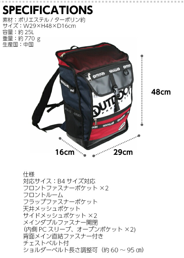 ![]() ![]() ![]() ![]() ・OUTDOOR PRDUCTS アウトドアプロダクツ TORRANCEシリーズ スクエアリュックサック。 メンズ・レディースともに背負える男女兼用デザインで、ロゴプリントがポイント。 背面はメッシュ素材で快適な背負い心地。 軽量で丈夫なつくりなので、荷物の多い学生さんや社会人におすすめ。 入学・新学期・新生活のプレゼントにも喜ばれます。