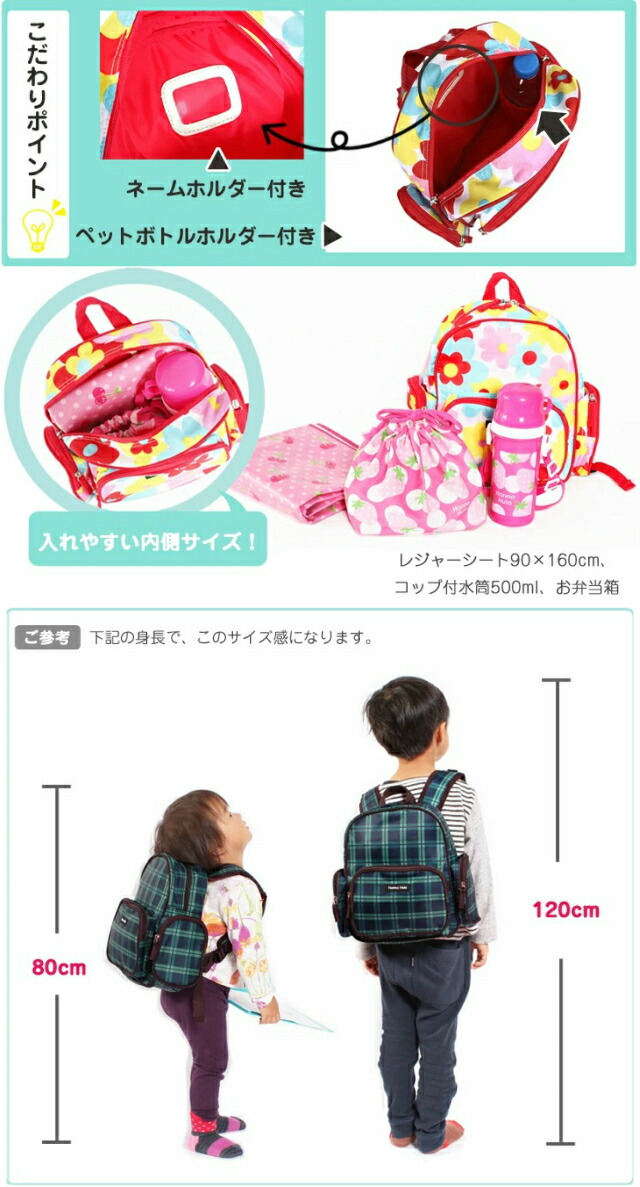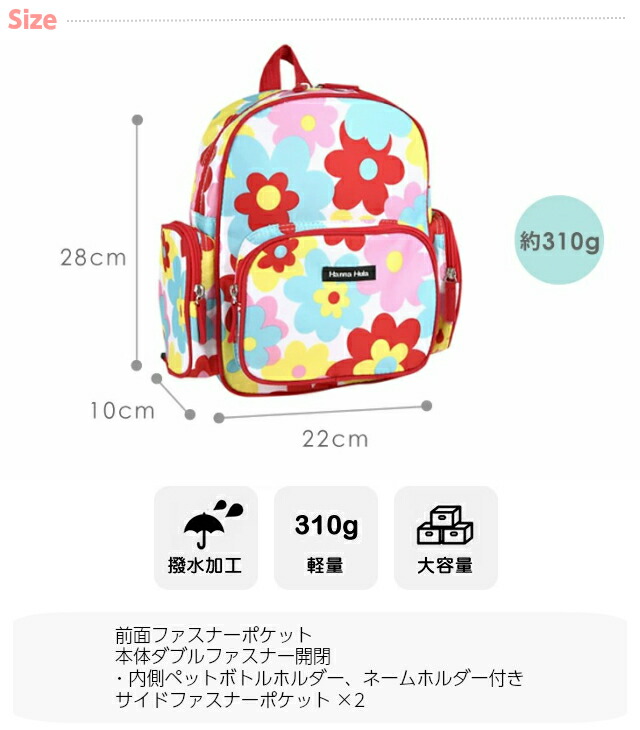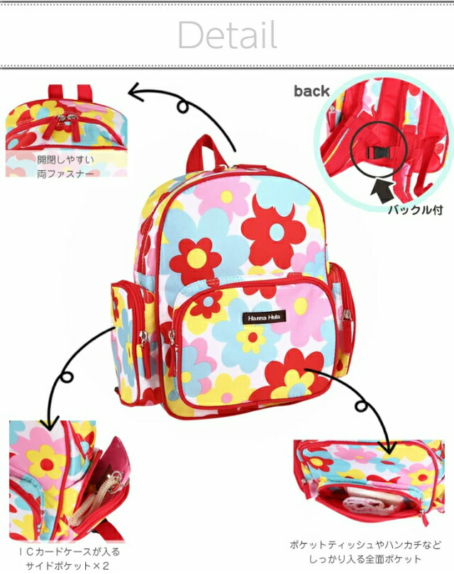 ![]() ![]() ![]() ![]() ![]() ・Hanna Hula(ハンナフラ) 女の子や男の子が好きなモチーフを使った可愛いキッズリュックサック。 チェストベルト付きで体にしっかりフィットします。 コンパクトな本体には大きいポケットが付いているので収納力も抜群!通園バッグやおけいこバッグとしてや、遠足やピクニックなどの楽しいおでかけにピッタリです。