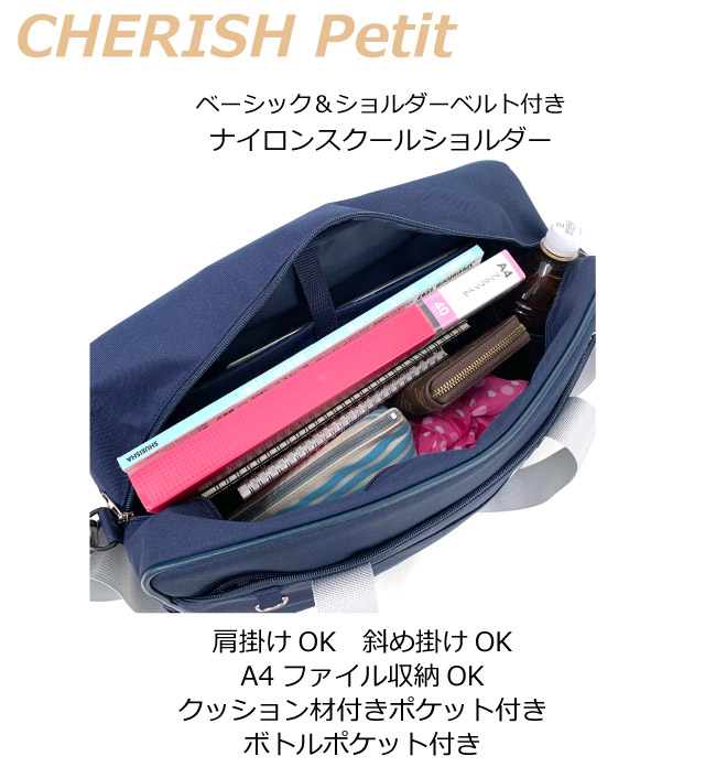 スクールバッグ 女子高生 ナイロン CHERISH Petit スクールラテ スクールバッグ dsr-575 ショルダー スクバ スクールバック ボトルポケット付き 高校生 中学生 中学校 女子 通学かばん 通学鞄 通学バッグ 可愛い おしゃれ かわいい サブバッグ 黒 紺 a4 b4 ショルダー付き