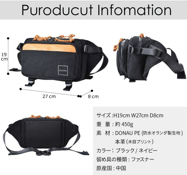 ![]() ![]() ![]() ![]() ![]() ![]() ![]() ![]() ![]() ![]() ・GUAPA(グアパ) 本体生地は撥水性・耐水圧・耐光性、耐摩擦性に優れたオランダ製生地のDONAUを採用。 風合いはソフトでありながら、ハリとコシがあるのが特徴。 シリーズのポイントである木目のレザーは、ブランドシンボルである木製自転車のフレームをイメージ。 メインルームはA5サイズの手帳やお財布、他にも500mlのペットボトルやカメラなどマルチに収納が可能です。 フロントはペン差しや、キーフック、小物が入るファスナーポケットを搭載。 背中はクッション性のあるメッシュ素材を採用。長時間背負っても疲れにくく通気性が良いため蒸れにくい工夫をしております。 タウンユースから、通学通勤、スポーツや旅行のサブバッグでもお使いいただけます。