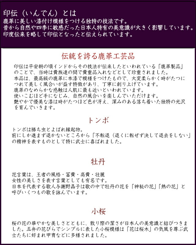 ![]() ![]() ![]() ![]() ![]() ![]() ![]() 印伝(いんでん) 最高級の鹿革に本漆で模様をつけた長財布。 時がたつにつれて美しく風合いが増す特徴があり、丁寧につくりあげています。 漆は新品時は少し落ち着いた色調ですが、お使いいただくほどに色が明るく冴え、光沢も増します。 柄は、「トンボ」「小桜」「ボタン」の3種類。 老若男女問わず人気の高級感のある長財布。 お母さん・おばあちゃんへのお誕生日・母の日・敬老の日のプレゼント・ギフトにも人気です。