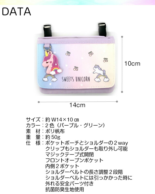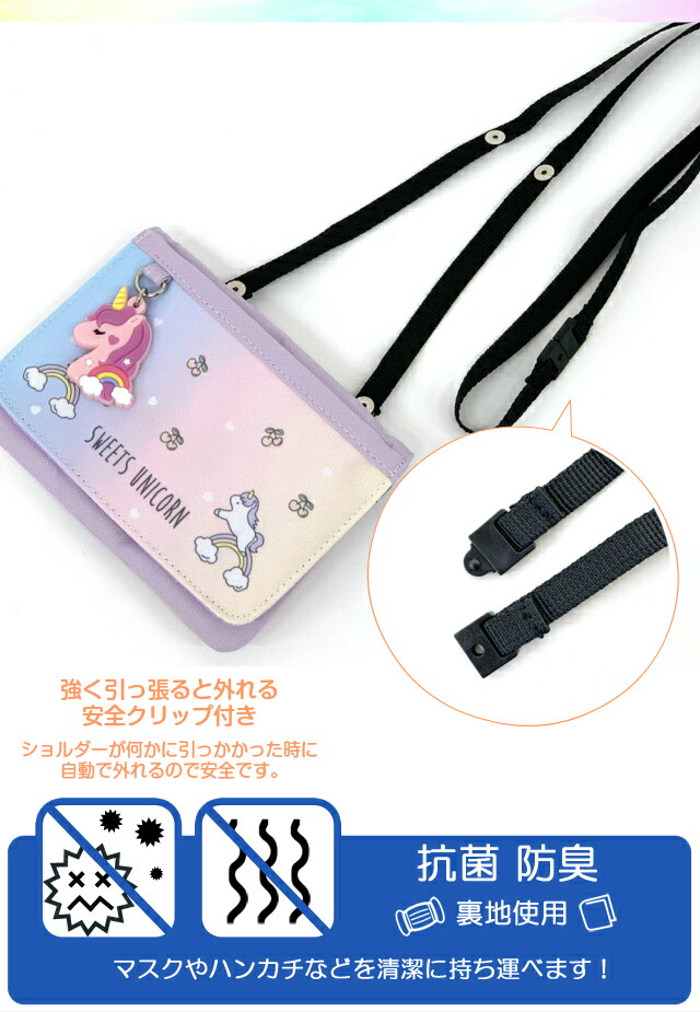 移動ポケット 女の子 ショルダー pop parlor グラデキャラ フラットショルダー wqt-531 ポケットポーチ ポシェット キッズ 小学生 高学年 低学年 かわいい クリップ ポケット ポーチ 移動 マスク入れ ポケットのない パープル グリーン 緑 ユニコーン グッズ 抗菌 防臭