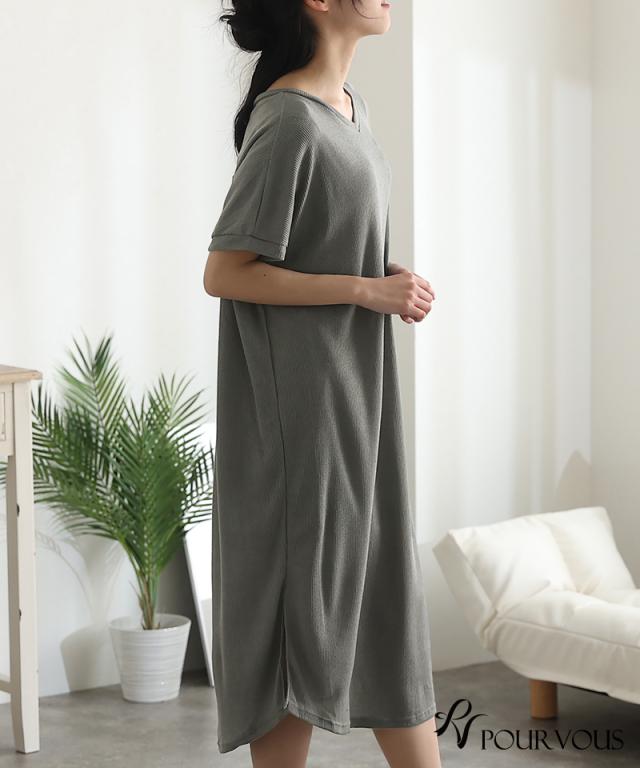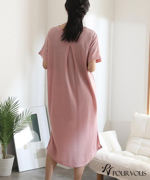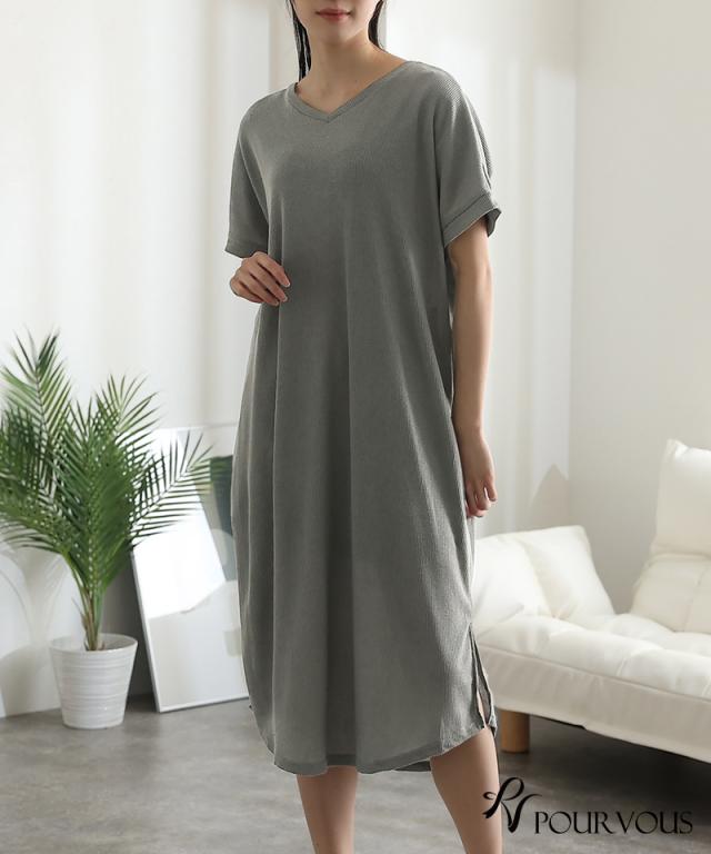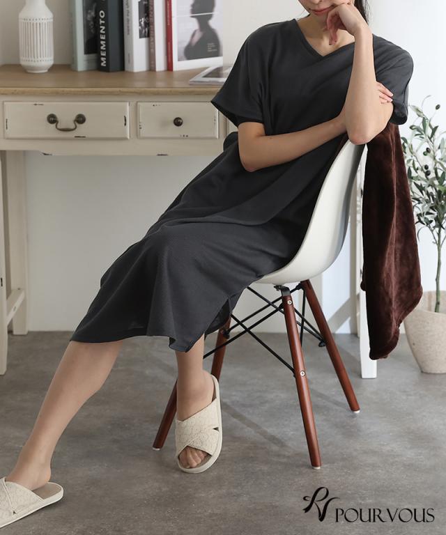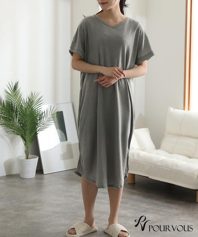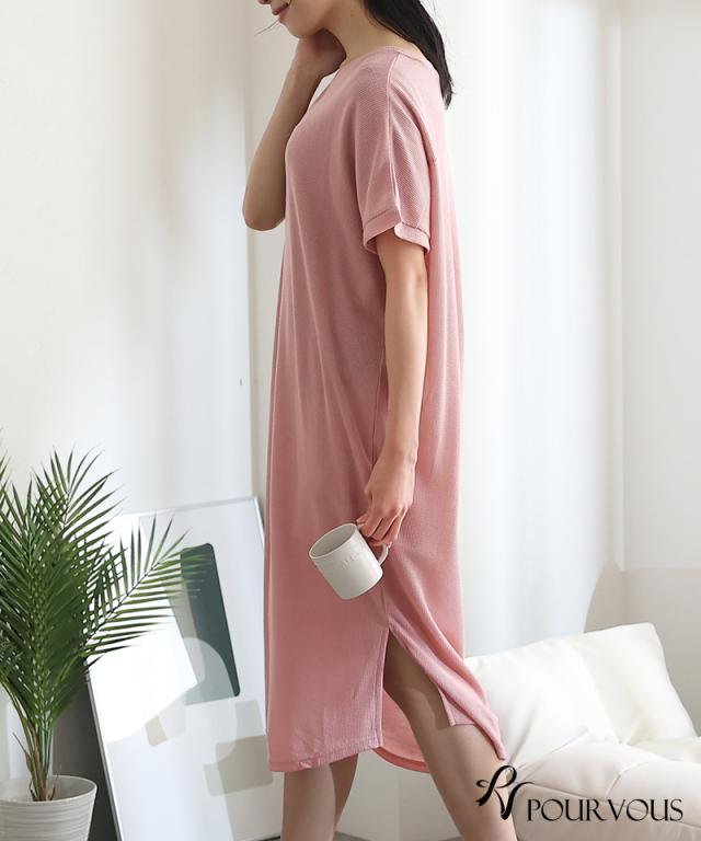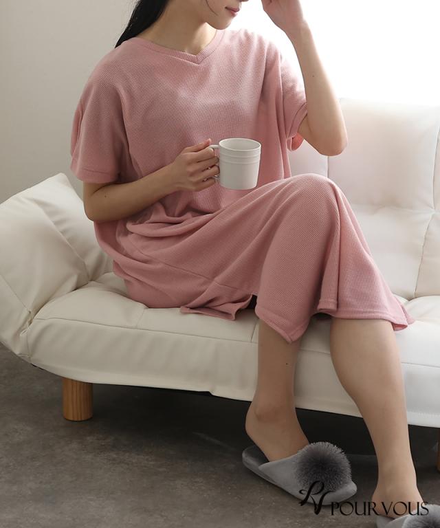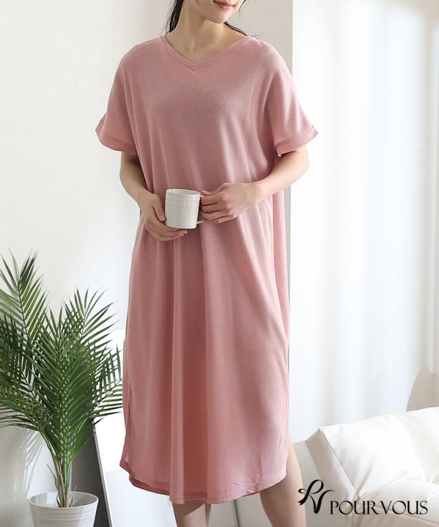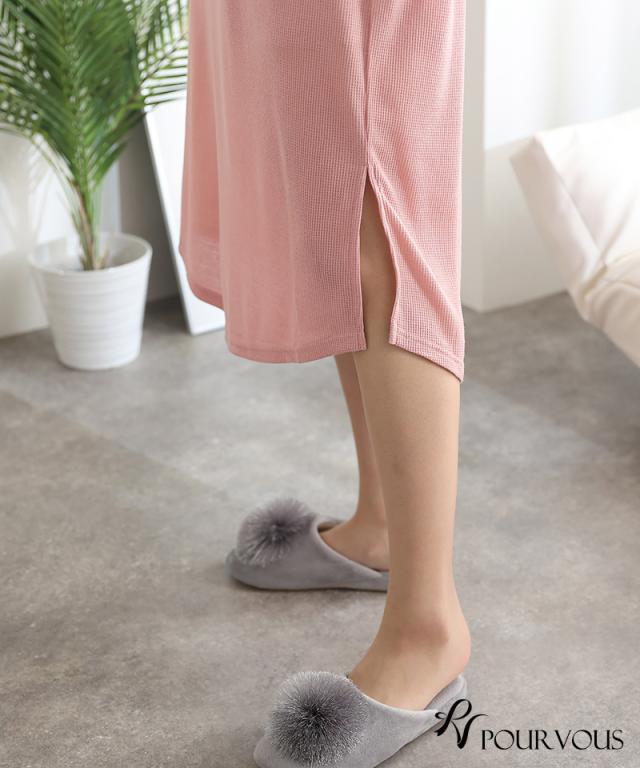 ワッフルVネックスリットワンピ【191221419】 レディース ルームウェア ナイトウェア 部屋着 パンツ パジャマ セットアップ ワンピース 寝間着 上下セット 夏 春 S M L 20代 30代 40代 50代 3点セット 無地 キャミソール 長袖 ウエストゴム 大きいサイズ