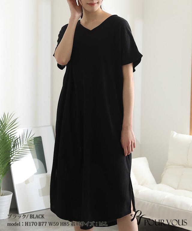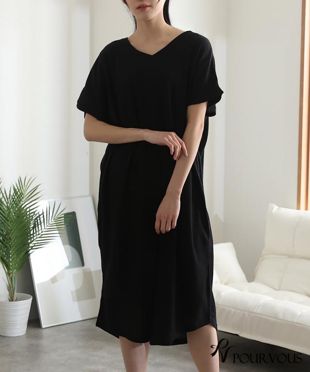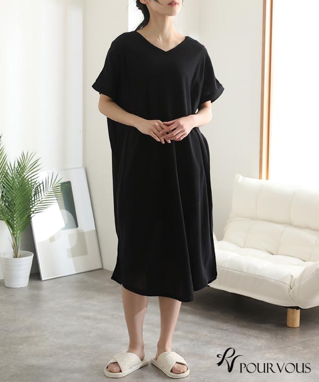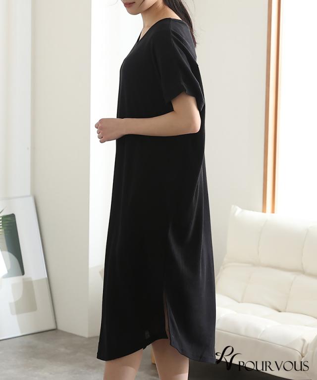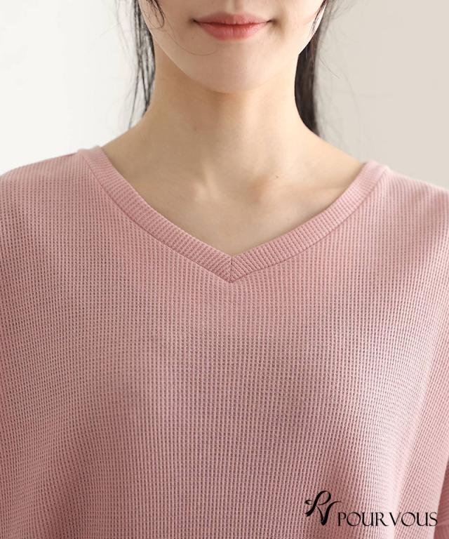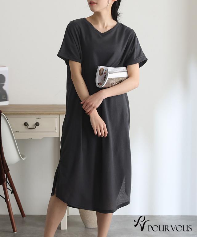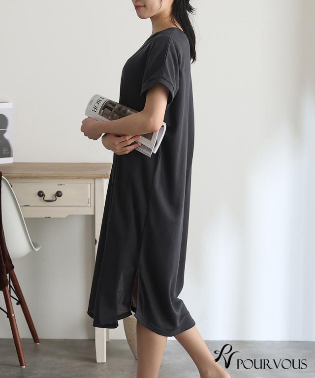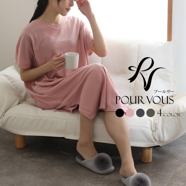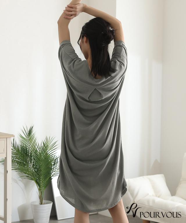 ワッフルVネックスリットワンピ【191221419】 レディース ルームウェア ナイトウェア 部屋着 パンツ パジャマ セットアップ ワンピース 寝間着 上下セット 夏 春 S M L 20代 30代 40代 50代 3点セット 無地 キャミソール 長袖 ウエストゴム 大きいサイズ