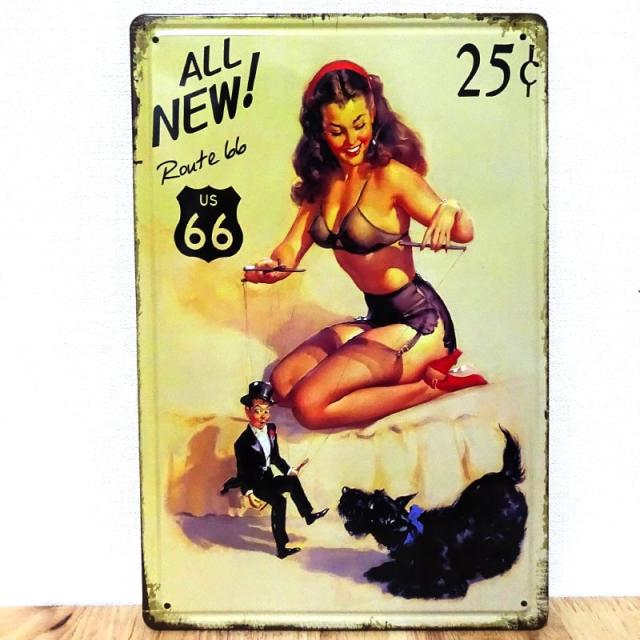 ブリキ看板 可愛い ALL NEW Route 66 セクシー ビンテージ 犬 アンティーク ガレージ かわいい プレート おしゃれ
