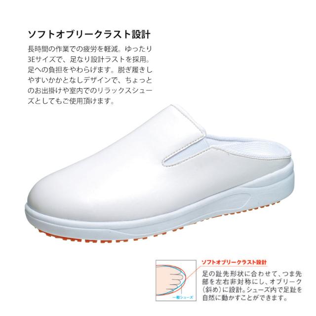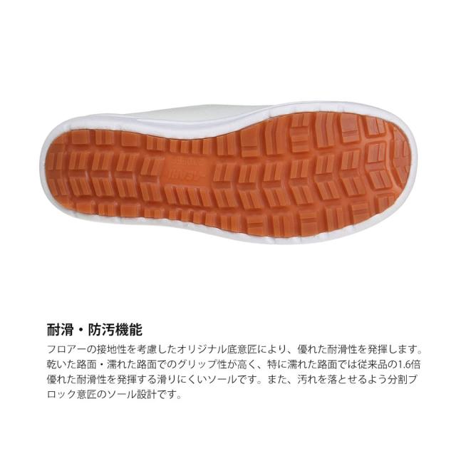 ソールは長時間の立ち仕事にも疲れにくいよう軽量性、クッション性があり変形をおこしにくい耐油配合の滑り難い設計。