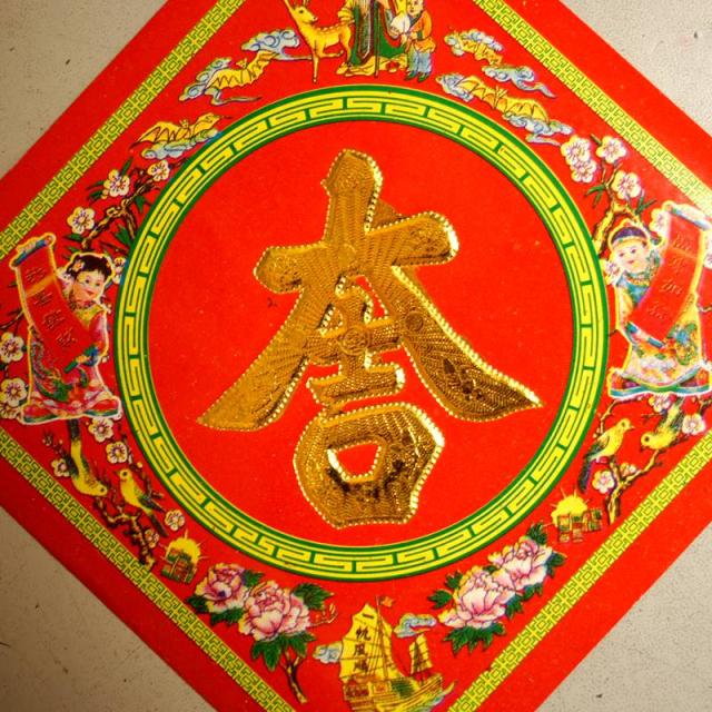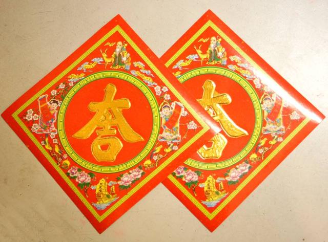 中国では壁に文字を張り、良い事が家に起こる様にと願を掛けます。文字の回りは財神や吉祥童子、元宝などの有り難い吉祥のシンボルが配されています。これらを賀紙と呼びます。最も一般的な【大吉】の字で、縁取りに色々な縁起のいい模様を配してあります。