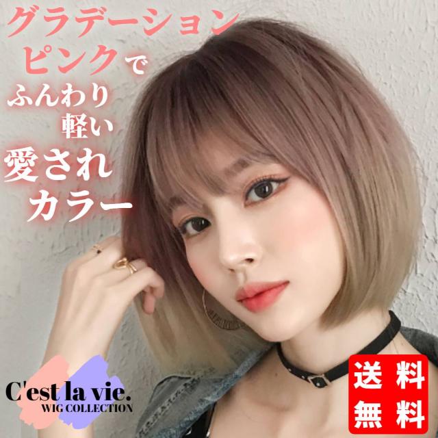 翌日出荷 フルウィッグ ショート ボブ グラデーション ピンク 医療用 かつら ネット付き 自然 小顔