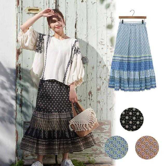 Shanti Shantiスカート フラワーボーダー 春にピッタリのフラワーボーダーで明るく、キレイに。 切り替えでふんわりかわいいシルエットに。 インドの伝統的なモチーフでありながら、ふんわり軽く、明るいカラーリングでどこか大人かわいい印象をもたらします。 春先に店頭を明るくしてくれるシリーズです。