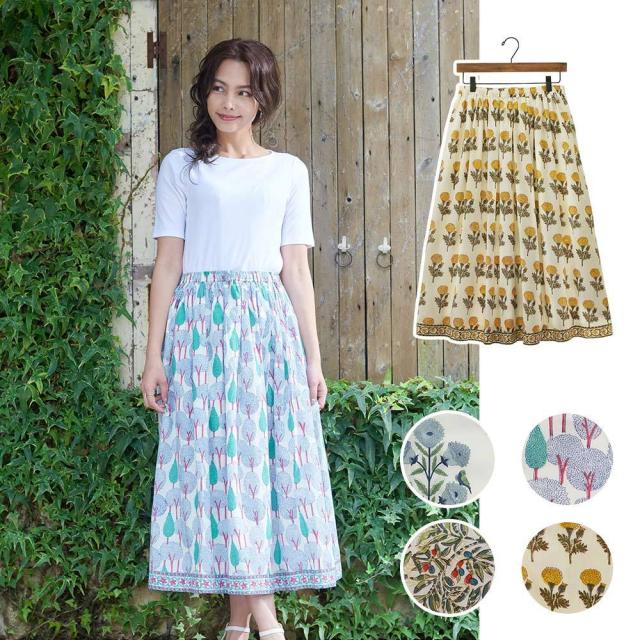 PORINAスカート デインティー ライン デイリーウェアに手仕事の風合いとオリエンタルなスパイスを。 インドの伝統技法「ブロックプリント」。木版を使って、職人がひと版ひと版、手でスタンプを押すように生地の上にプリントしていきます。 ブロックプリントはすべて職人による手仕事です。 可愛いプリントですが、程よいボリューム感で甘くなりすぎない大人のスカート。 カットソー、フーディーでカジュアルに。ブラウス、シャツであわせて上品にも着られます。