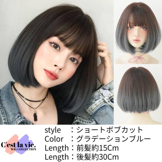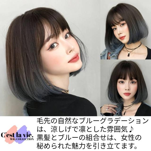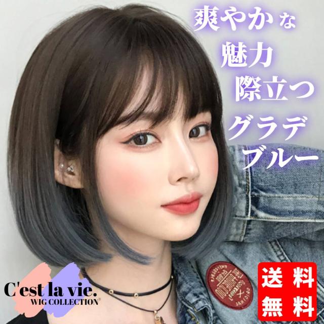 翌日出荷 フルウィッグ ショート ボブ グラデーション ブルー 医療用 かつら ネット付き 自然 小顔