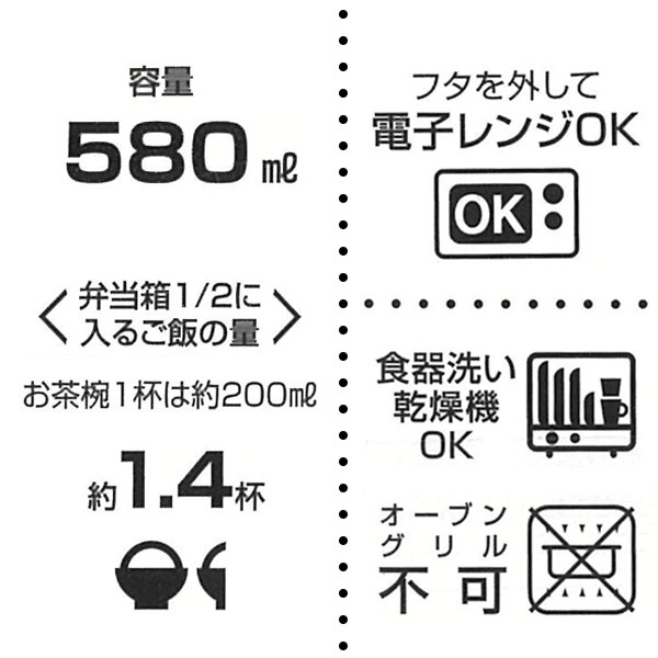 容量580ml。弁当箱1/2に対し、お茶碗約1.4杯分のご飯が入ります。