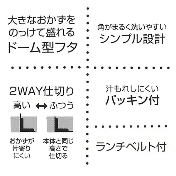 材質:フタ/メラミン樹脂 本体・仕切り/ポリプロピレン パッキン/シリコーンゴム ランチベルト/天然ゴム
