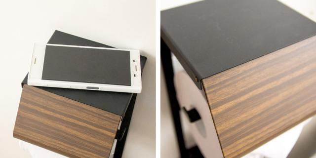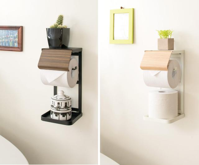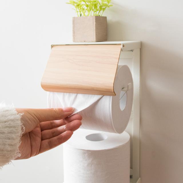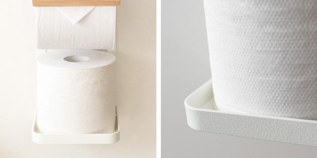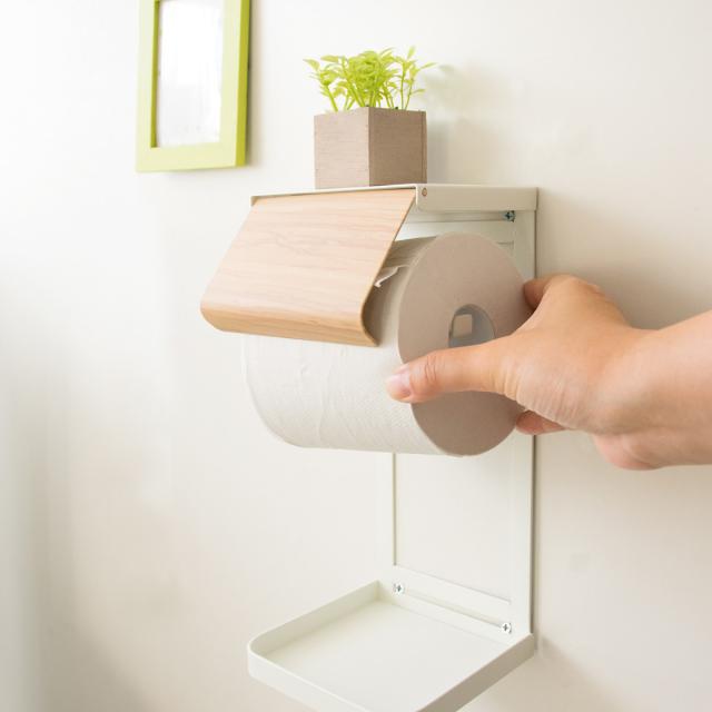 | ちょい置きが出来るフラットな天板付き ちょい置きの出来るフラットな天板は携帯電話を置いたり、小物や芳香剤置きにぴったりです。 | 長く使えるこだわり素材 フレームは強度の高いスチール製でしっかりペーパーを支えます。木目部分にはきれいな木転写、砂目調の単色部分は傷や水に強い粉体塗装を施しています。 |