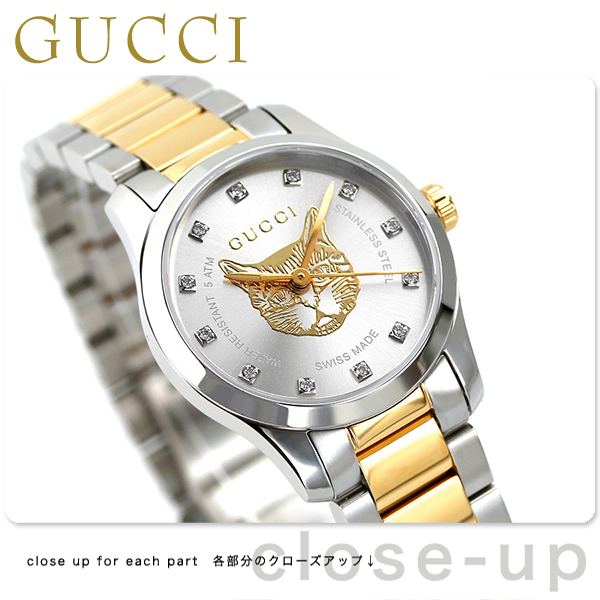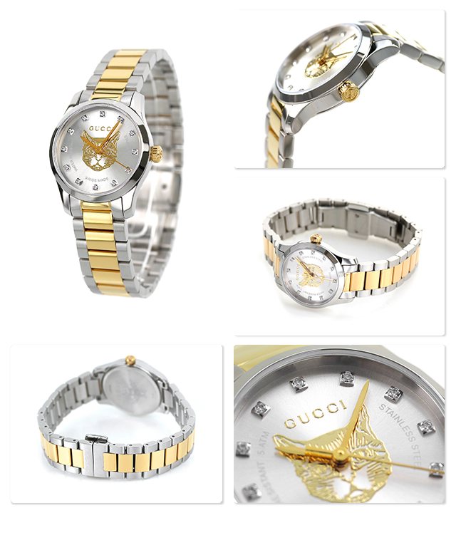 7年保証キャンペーン グッチ Gタイムレス 27mm スイス製 クオーツ レディース 腕時計 YA1265016 GUCCI G-TIMELESS アナログ シルバー×ゴールド ◆1921年、グッチオ・グッチは革製品の会社を起業し、フィレンツェに小さな鞄店を開業。ブランドに対する彼のビジョンは、ロンドンと、彼がサボイ・ホテルで働いていた時に見た英国貴族の洗練された審美眼から培われたものです。財布や革製品以外にもアクセサリーや腕時計も品質の高さや、洗練されたデザインが人気で一気に高級ブランドの地位を確立しました。今では名を知らない人はいないぐらい世界的に有名なブランドです。 時代に左右されないクラシカルでスタイリッシュなデザインが特徴のGタイムレスシリーズ。文字盤中央にデザインされた猫が特徴のモデル。