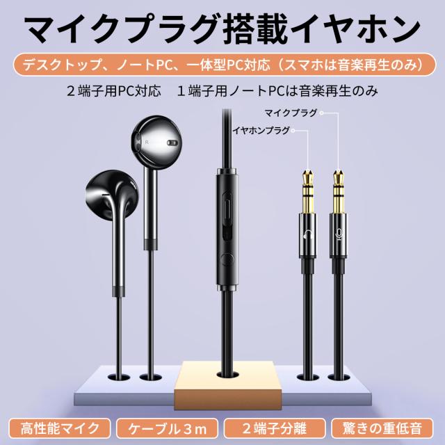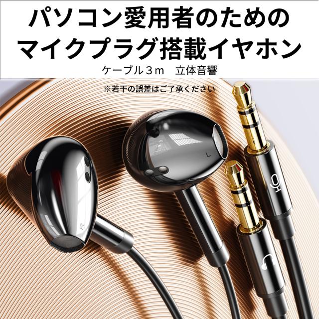音声とマイクの3.5mmプラグが2つに分岐した3mロングケーブルマイク付き 高音質 イヤホン